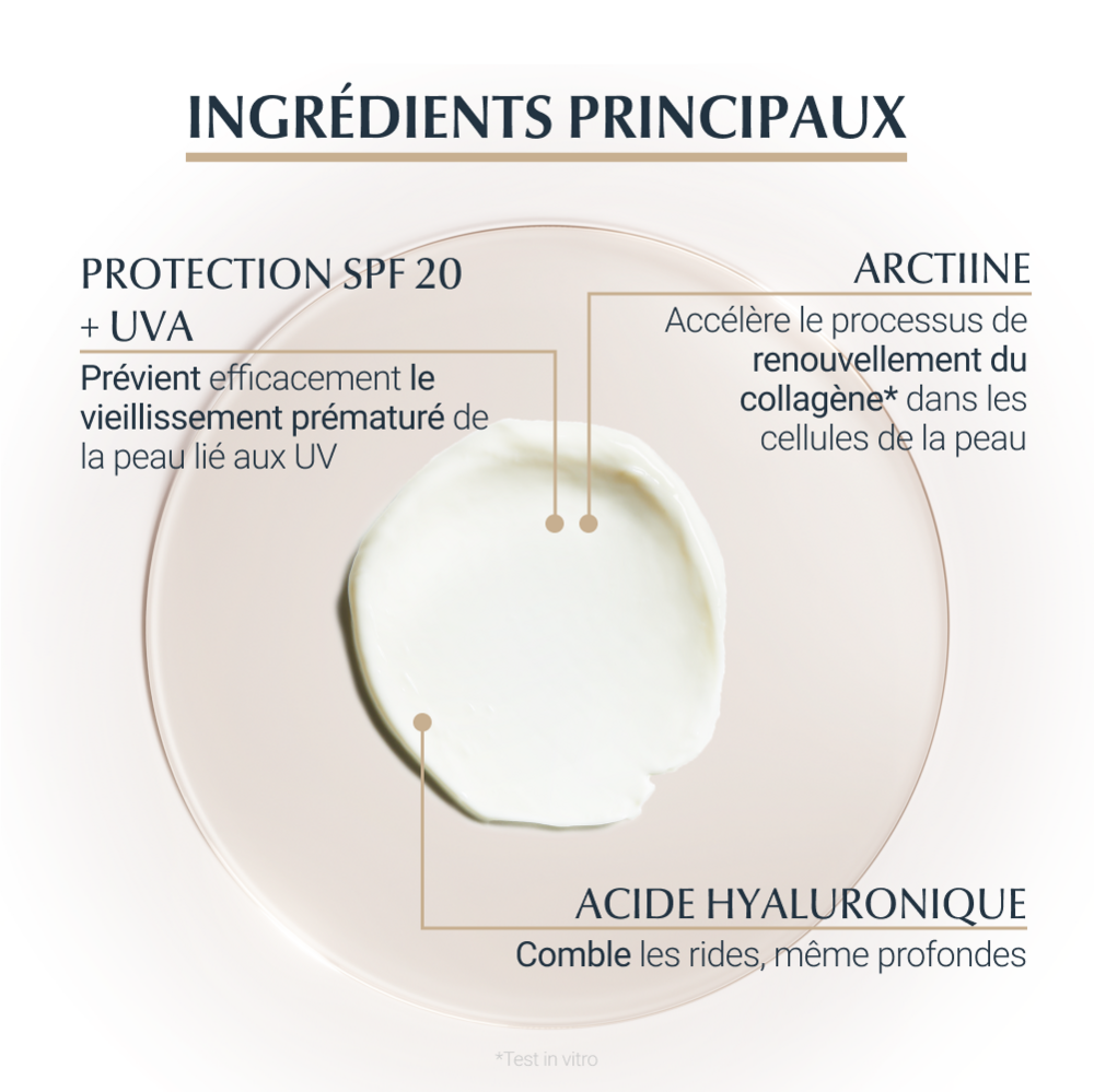 - Amélioration de l'élasticité : Le Complexe Collagène-Élastine, une puissante combinaison d'Arctiine et de Créatine, stimule la production naturelle de collagène* et augmente l'élasticité de la peau.