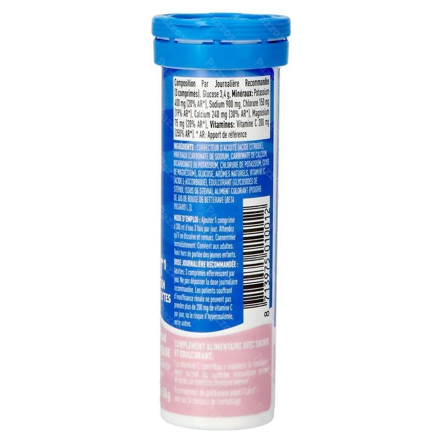 Régulateur de l'acidité (acide citrique), minéraux (carbonate de sodium, carbonate de calcium, hydrogénocarbonate de potassium, chlorure de potassium, oxyde de magnésium), dextrose, arômes naturels, vitamine C (acide L-ascorbique), édulcorant (glycosides de stéviol provenant de la stévia), colorant (poudre de jus de betterave rouge (Beta Vulgaris L.)).