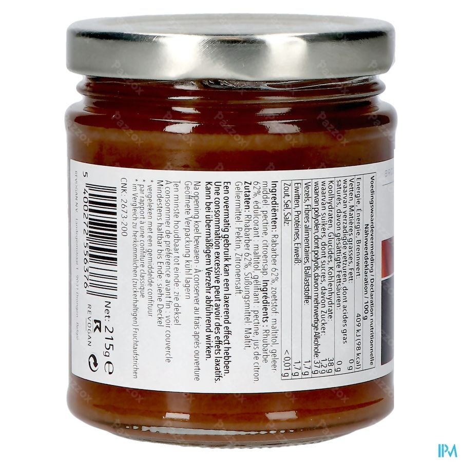 Rhubarbe 62%, édulcorant : maltitol, gélifiant : pectine de pomme, jus de citron.