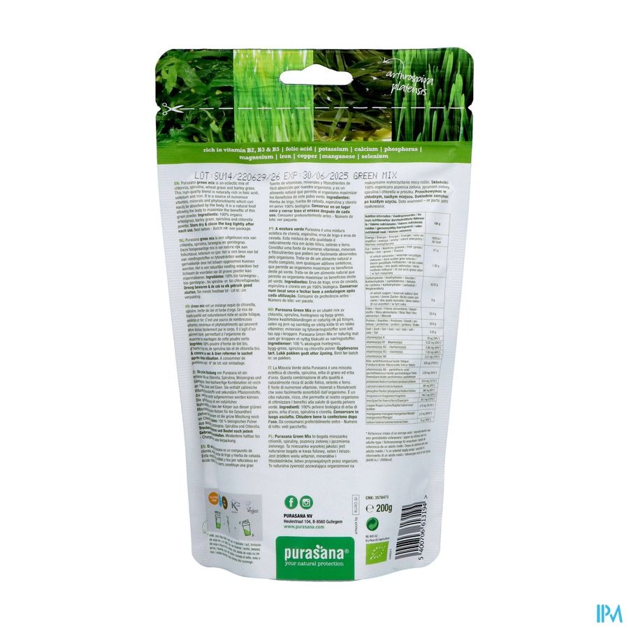 Green mix est un mélange de chlorella, de spiruline, d'herbe de blé et d'herbe d'orge. Ce mélange est naturellement riche en acide folique, en sélénium et en fer et est facilement absorbé par le corps. En mélangeant le Purasana Green Mix avec un smoothie ou un yaourt, vous absorberez facilement les éléments nutritifs importants que contiennent ces algues et ces herbes.