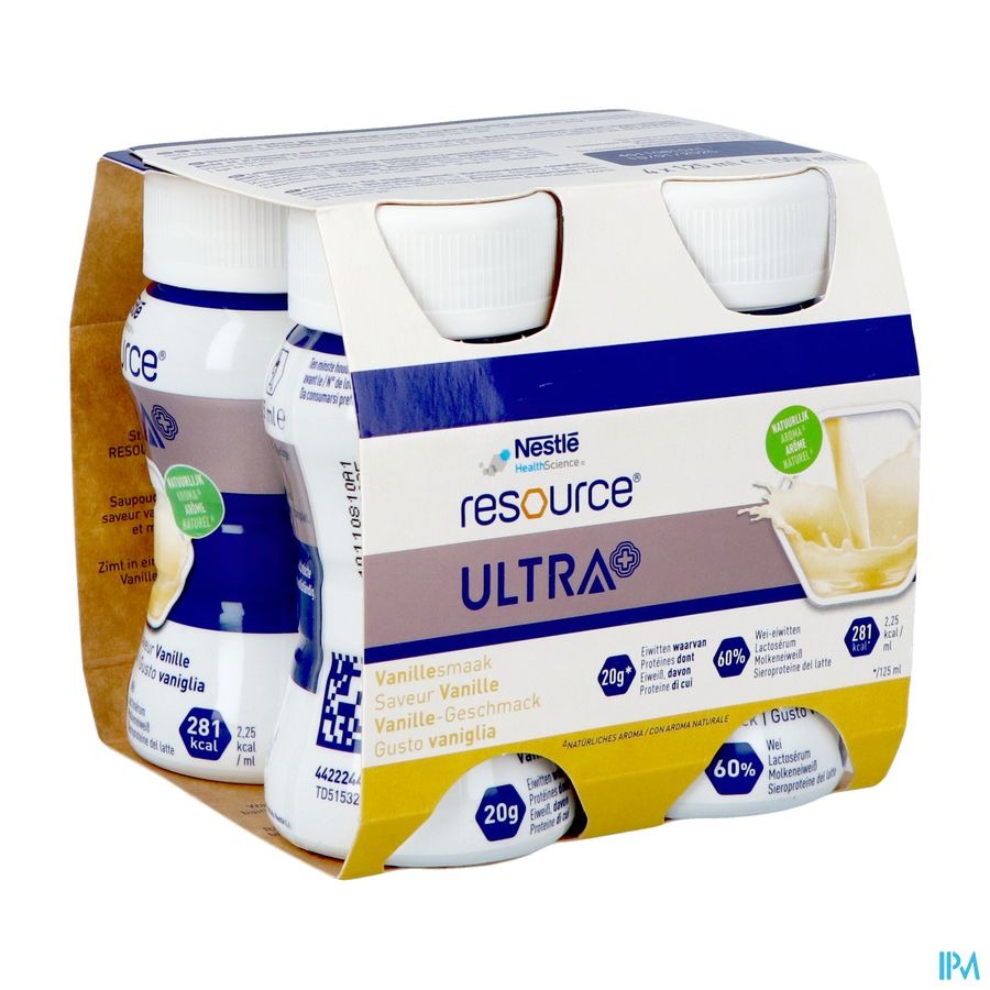 Resource Ultra+ est un aliment riche en protéines et en énergie. Une bouteille de 125 ml contient 20 g de protéines de lactosérum (28 % de kcal) et 281 kcal (2,25 kcal/ml). Nutrition à usage médical en cas de malnutrition ou de risque de malnutrition chez l'adulte.