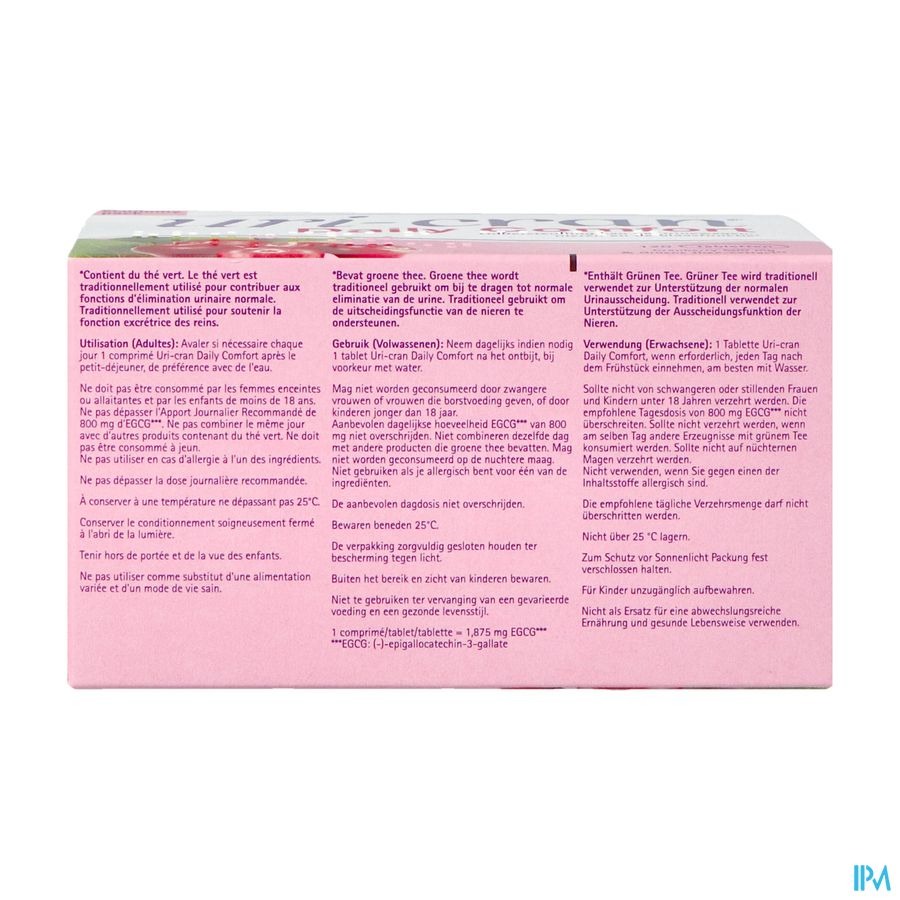 Uri-Cran Daily Comfort est un complément alimentaire à base d'extraits de canneberge et de thé vert pour soutenir les fonctions des voies urinaires, des reins et de la vessie. L'extrait de canneberge aide à empêcher les bactéries d'adhérer aux parois des voies urinaires, réduisant ainsi le risque d'infections urinaires. L'extrait de thé vert peut favoriser la production d'urine et le rinçage des voies urinaires.