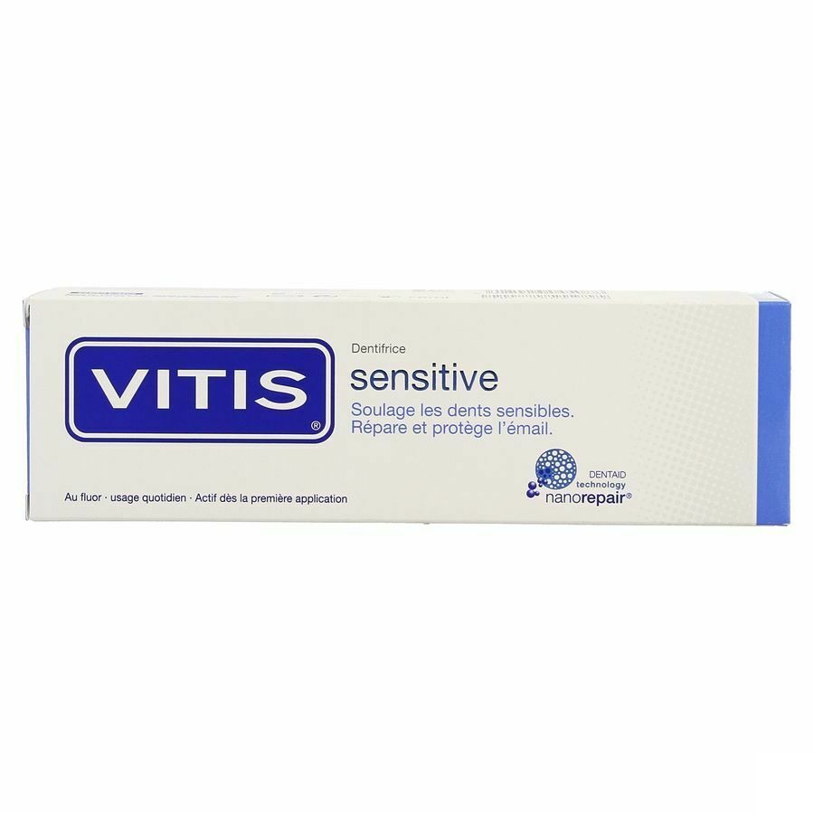 VITIS Sensitive Dentifrice est un soin buccodentaire à utiliser au quotidien pour lutter contre les dents sensibles. La formule repose sur la DENTAID haprepair technologie révolutionnaire (en 5 actions). Cette technologie fonctionne grâce à l’action de minuscules particules d’hydroxyapatite qui se fixent sur la surface dentaire. Leur taille leur permet d’être entièrement absorbées par l’émail et la dentine des dents. Les dents sont donc mieux protégées contre les agressions extérieures.