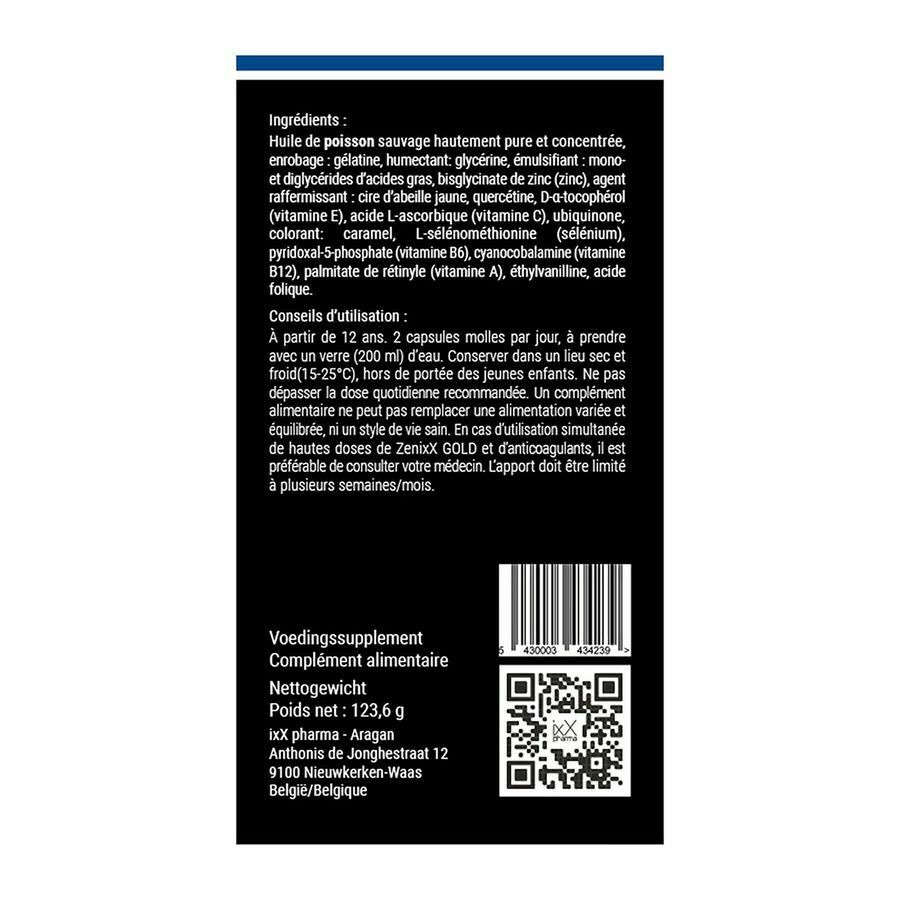 Ingrédients : Huile de poisson sauvage concentrée de haute pureté, enrobage : gélatine, humectant : glycérine, émulsifiant : mono- et diglycérides d'acides gras, bisglycinate de zinc (zinc), agent raffermissant : cire d'abeille jaune, quercétine, D-α-tocophérol (vitamine E), acide L-ascorbique (vitamine C), ubiquinone, colorant, caramel, L-sélénométhionine (sélénium), pyridoxal-5-phosphate (vitamine B6), cyanocobalamine (vitamine B12), palmitate de rétinyle (vitamine A), éthylvanilline, acide folique.