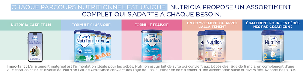 C’est pourquoi, depuis 130 ans, les équipes de scientifiques, pédiatres et nutritionnistes chez Nutricia développent les formules Nutrilon® les plus avancées, afin d’offrir le meilleur de leur science. Explorez la gamme complète : des laits pour nourrissons, de suite et de croissance. Demandez conseil à votre pharmacien. IMPORTANT : Le lait maternel est l'alimentation idéale pour votre bébé.