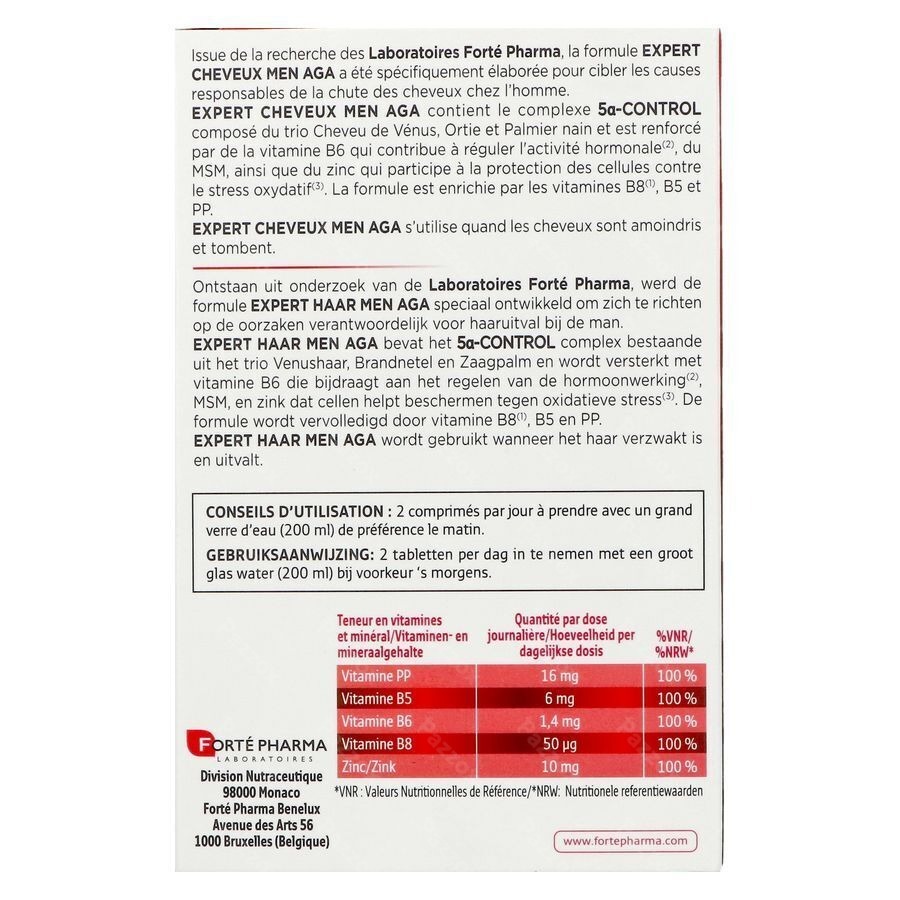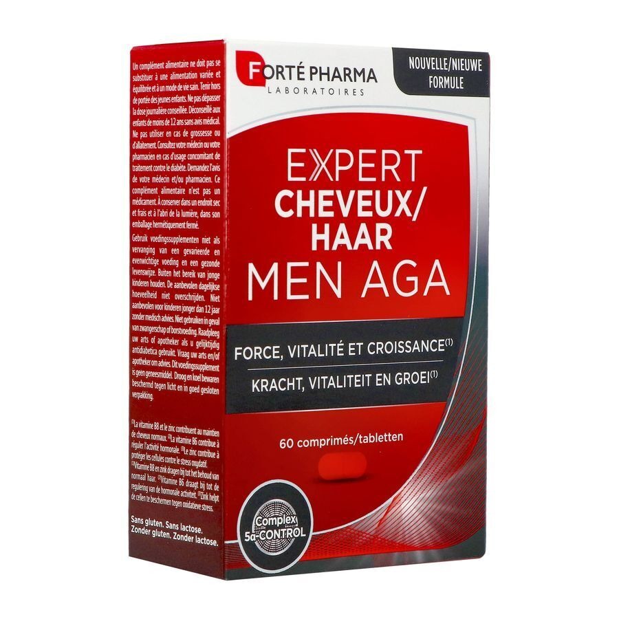 Ontstaan uit onderzoek van de Laboratoires Forté Pharma, werd de formule EXPERT HAAR MEN AGA speciaal ontwikkeld om zich te richten op de oorzaken verantwoordelijk voor haaruitval bij de man.