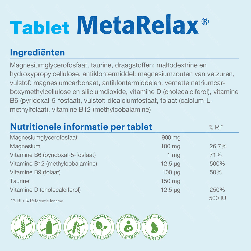 MetaRelax is een magnesiumsupplement op basis van magnesiumglycerofaat (deze vorm wordt goed verdragen door maag en darmen) aangevuld met vitamine B6, B12, D, Metafolin en ta...