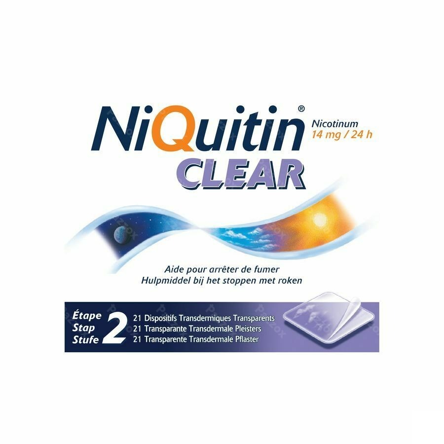 - 14 mg vormt de tweede stap in de rookstopbehandeling: NiQuitin® Clear Patch bestaat uit 3 sterktes (21 mg, 14 mg en 7 mg). Ze geven elk een verschillende hoeveelheid nicotine af. Je bouwt dus geleidelijk in 3 stappen je behoefte naar een sigaret af (cf. Doseringsschema).