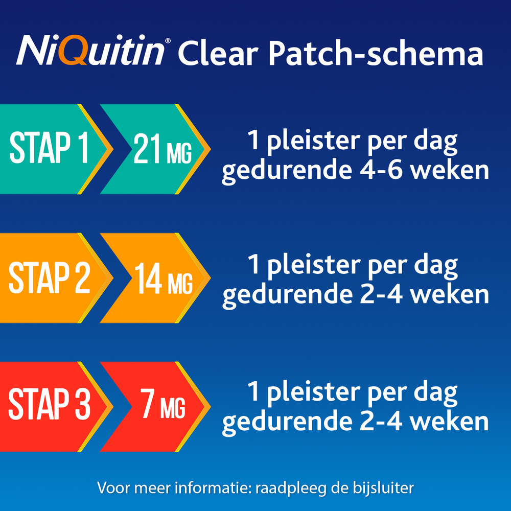 - 21 mg vormt de eerste stap in de rookstopbehandeling: NiQuitin® Clear Patch bestaat uit 3 sterktes (21 mg, 14 mg en 7 mg). Ze geven elk een verschillende hoeveelheid nicotine af. Je bouwt dus geleidelijk in 3 stappen je behoefte naar een sigaret af (cf. Doseringsschema)