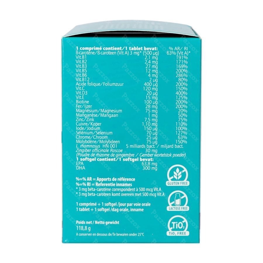 - Elke tablet bevat 30 mg gember en de softgel bevat twee soorten polyonverzadigde langeketen omega-3 vetzuren, DHA (300mg) en EPA 63.8mg), die bijdragen tot de ontwikkeling van de ogen en de hersenen van de foetus en van het kind dat borstvoeding krijgt. Deze essentiële vetzuren dragen ook bij tot een normale werking van het hart. De gember en de softgel met neutrale smaak vergemakkelijken de vertering gezien zwangere vrouwen meer gevoelig zijn aan dergelijke preparaten!