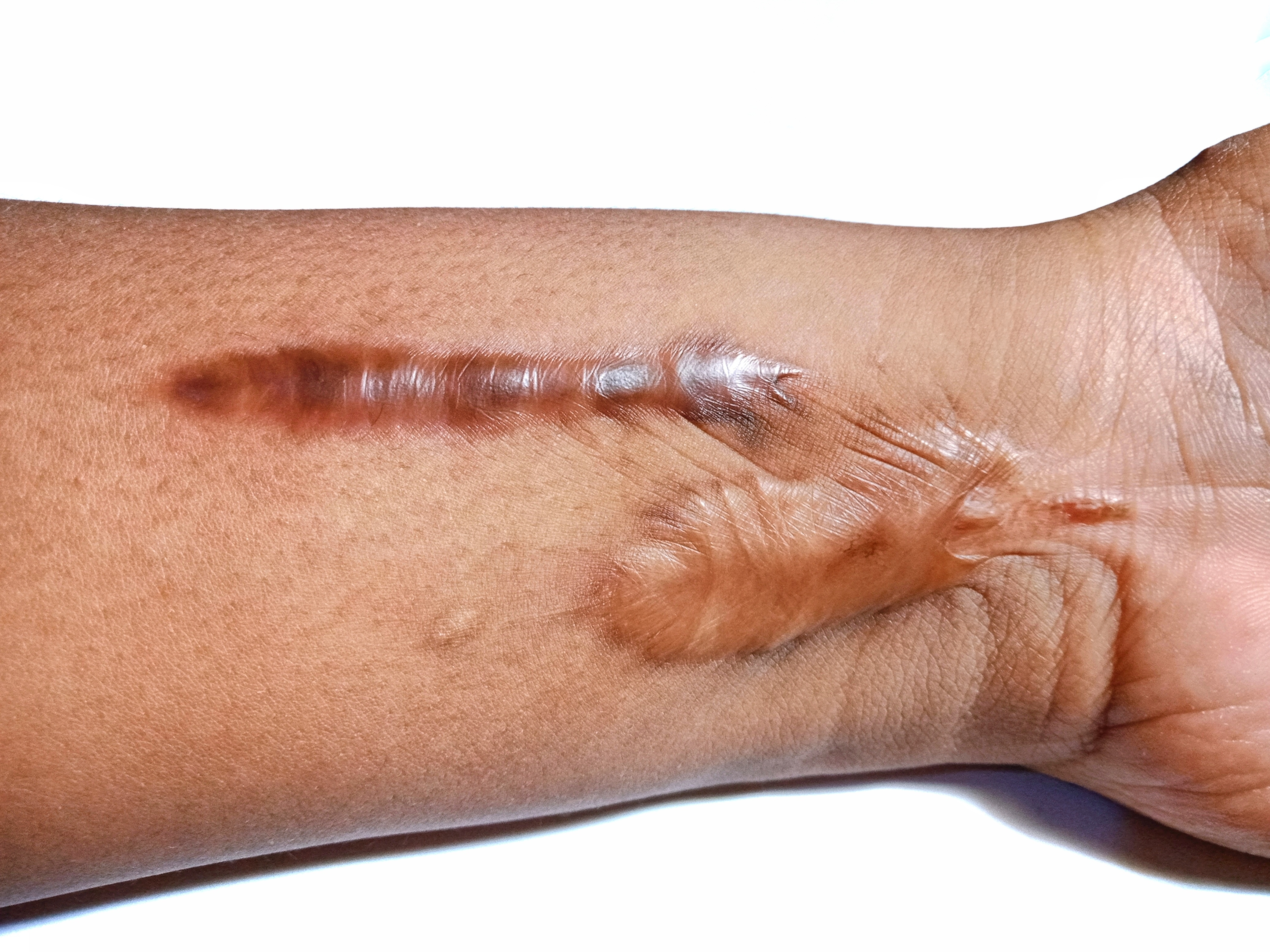 Hypertrofische littekens zijn verdikte, verheven littekens die ontstaan wanneer de huid tijdens het genezingsproces te veel collageen aanmaakt. Ze blijven meestal binnen de grenzen van de oorspronkelijke wond en kunnen rood of roze van kleur zijn. Vaak veroorzaken ze jeuk, pijn of een strak gevoel in de huid.